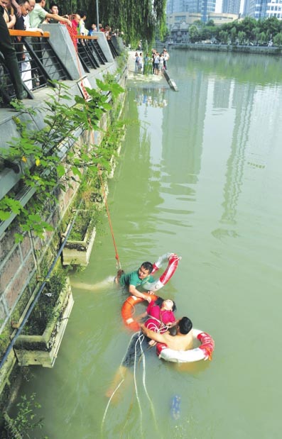 6月12日9时30分,九眼桥和安顺廊桥间的丝管路上,一阵呼喊声突然打破宁静,先是一位男子大喊:“救命,快来人!”紧跟着,散步市民的呼救声此起彼伏:“这里有人跳河了!”此时,河中间漂着一个红衣女子,双手扑腾,时沉时浮。